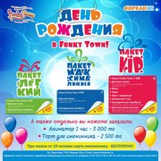 Funky Town – это самый крупный крытый развлекательный парк города Шымкент. Детский Парк Развлечений "FUNKY TOWN"приглашает ДРУЗЕЙ , на празднование день рождения своей МЕЧТЫ!!!! ещё более упрощённые пакеты.